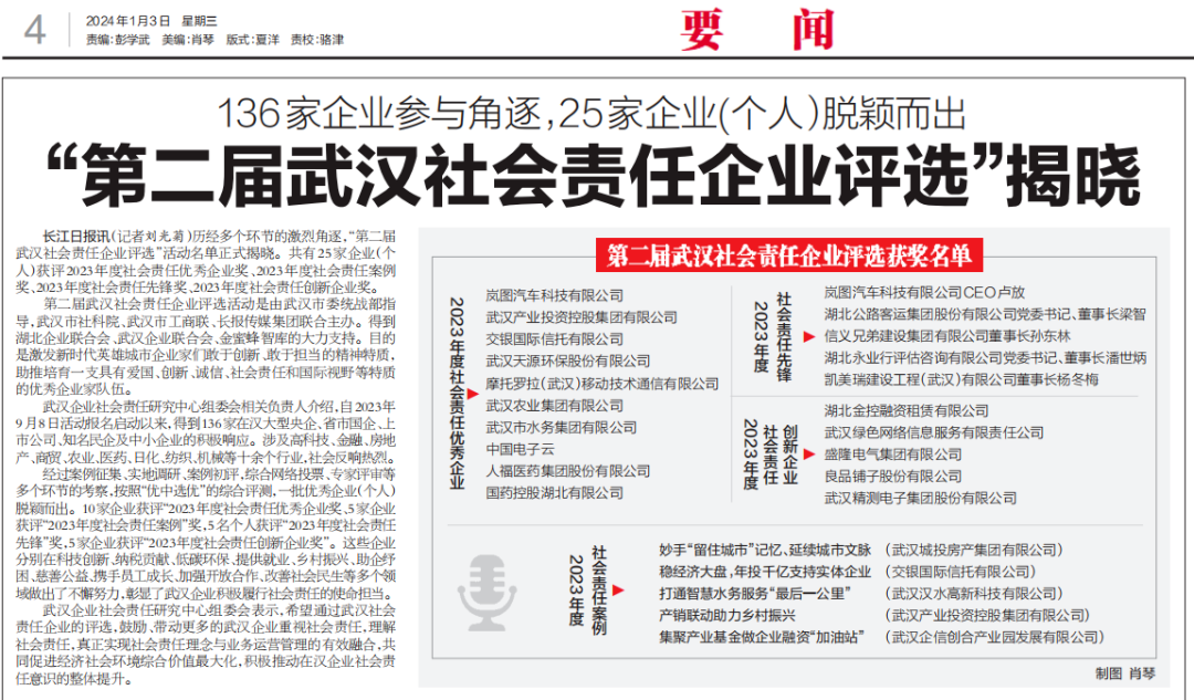 历经多个环节的激烈角逐,2024年1月3日,“武汉第二届社会责任企业评选”活动名单在长江日报正式刊登揭晓,25家企业(个人)脱颖而出。永业行党委书记、董事长潘世炳荣获2023年度社会责任先锋奖。 潘世炳始终将企业发展与社会责任深度融合,带领员工积极开展捐资助教、扶贫帮困、抗震救灾等社会公益事业,以个人和公司名义累计捐赠超过600万元,积极践行企业公民责任。充分发挥自身专业优势,聚焦调查研究,向省委省政府提交了高质量的调研报告、咨政建议20余篇,参与国家发改委、财政部、住建部、自然资源部等行业主管部门课题研究2