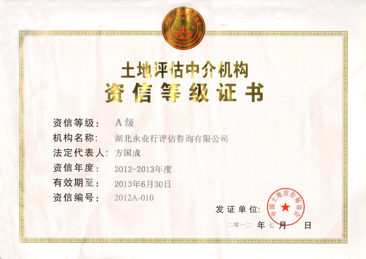 近日,中国土地估价师协会对2012-2013年度A级资信土地评估机构名单予以公布,永业行等评估机构榜上有名。永业行现为中国土地估价师协会常务理事、湖北省土地估价师协会常务副会长单位等,自2007年起已连续6年被评为A级资信土地评估机构。