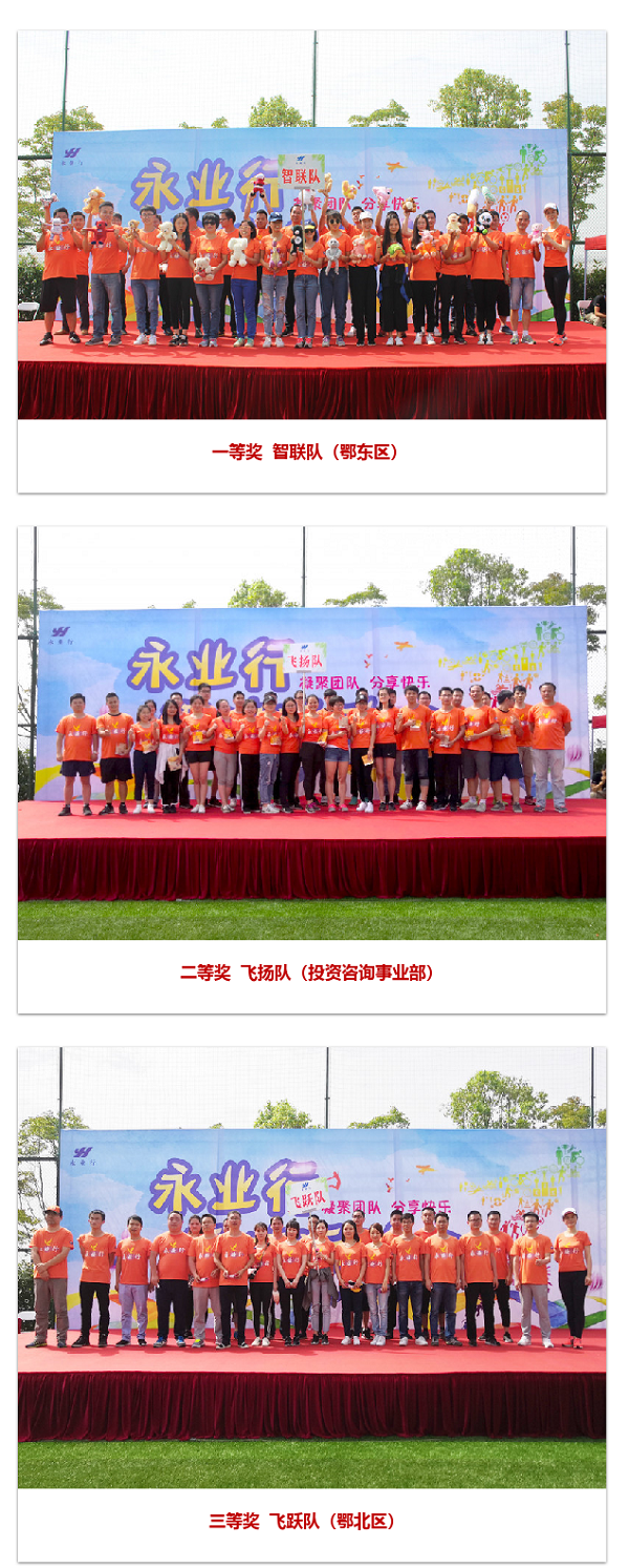 释放了一整天的洪荒之力,最激动人心的时刻终于来临啦!副总裁王琴在闭幕式中宣布了获奖的三个团队:智联队(鄂东区)、飞扬队(投资咨询事业部)、飞跃队(鄂北区)分别获得一、二、三等奖。祝贺三支队伍获得佳绩,But其他队伍也棒棒哒!“友谊第一,比赛第二”,挥洒的汗水、收获的友谊、增加的默契更加可贵!