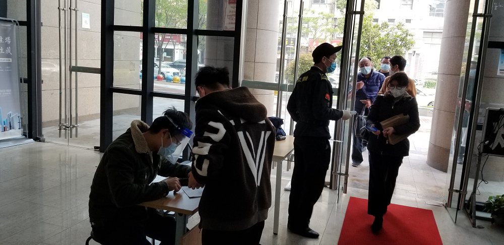严格排查登记每位返岗员工的外出史和接触史,确保复工员工的身体健康。在办公楼入口处设置体温测量专区,对到岗员工进行测量体温、扫码登记、酒精消毒等,体温符合标准且佩戴口罩的员工才能进入办公楼。实行A/B两组人员间隔上岗工作制,在保证各项工作正常开展的前提下,做到复工后第一阶段的14天内A/B两组人员不见面,最大限度减少感染风险。严格控制现场会议,采用视频、语音等线上方式。此外,为避免下班时人流密集,提前一小时下班,并由值班人员再次进行体温测量登记后离开办公区。安排专职人员每天下班后,对门厅、楼道、会议室、电梯、楼梯、卫生间以及临时隔离间进行全面消杀,并做好消杀登记。