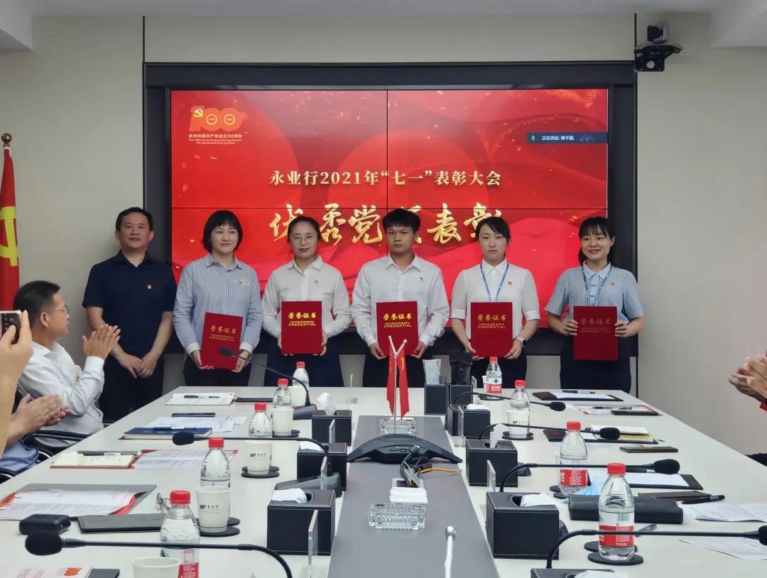 大会在雄壮的国歌声中拉开帷幕。永业行党委委员、副总裁雷小军、文云波分别宣读了《关于表彰2021年先进党支部的决定》《关于表彰2021年优秀党员的决定》,公司党委对自然资源党支部等3个先进党支部、刘亚玲等14名优秀共产党员进行了表彰并颁奖。