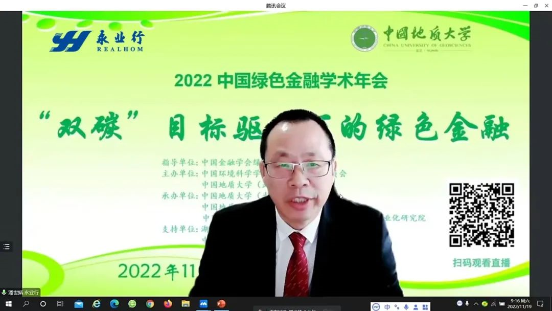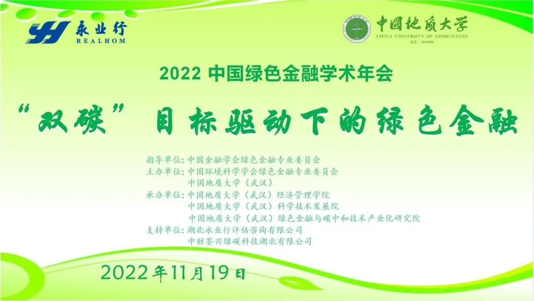 本次大会由中国金融学会绿色金融专业委员会指导,中国环境科学学会绿色金融专业委员会、中国地质大学(武汉)主办,永业行等单位支持,来自全国高校、研究机构及相关企业的专家、学者共聚一堂,通过线上线下“双互动”的模式,围绕当前双碳目标驱动下绿色金融领域的重点理论和实践问题展开热烈而深入的探讨。会议通过网络平台全程直播。
