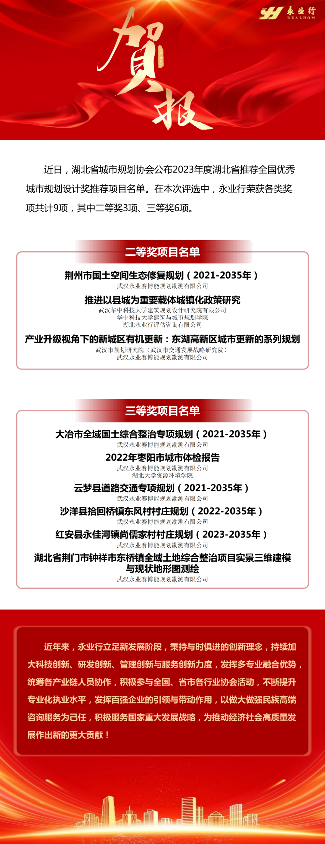 永业行九个项目入选湖北省推荐全国参选优秀城市规划设计奖