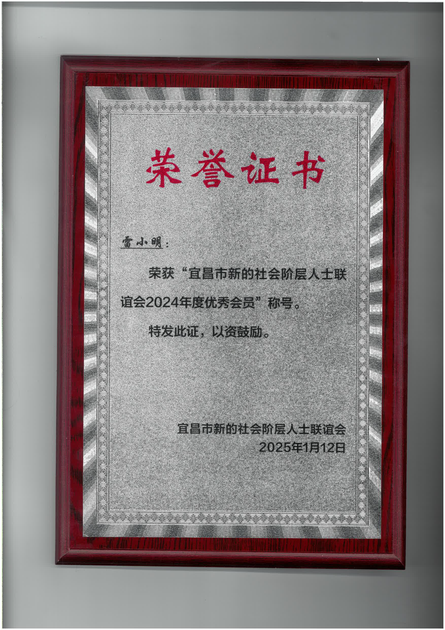 永业行雷小明荣获“宜昌市新联会2024年度优秀会员”称号