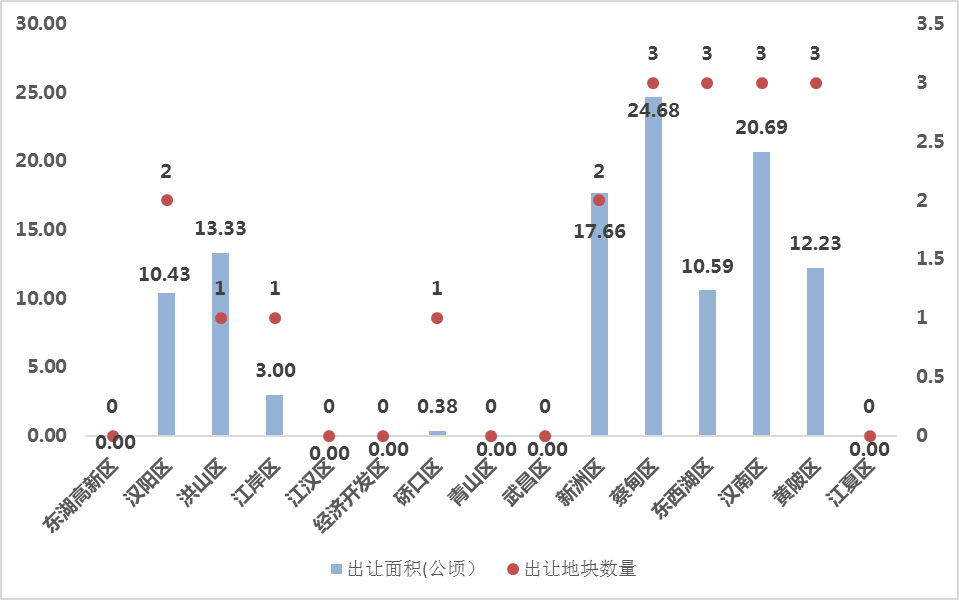 2018年11月,武汉市公开出让22宗地块(含1宗工业用地,另21宗均为经营性用地),其中3宗地块延期,其余19宗地块均已成交。11月土地出让面积145.07公顷(约2176.08亩),土地成交面积112.99公顷(约1694.79亩)。