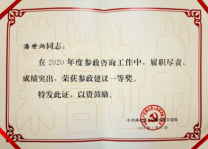 担任省政府参事以来,潘世炳同志积极参与参政咨询工作,先后就优化营商环境、争资立项、疫后重振、房地产市场规范管理、生态环境保护等进行深入调研,提出针对性的议政谏言。疫情期间,围绕疫情防控及疫情过后可能引发的一系列社会问题,积极建言献策,撰写的《关于疫情对我省房地产行业产生的影响及相关措施的建议》主要内容均被采纳,并形成了省政府文件《关于印发促进建筑业和房地产市场平稳健康发展措施的通知》(鄂政办发〔2020〕13号);带队组成省政府参事调研组,赴各地就争资立项、投资落地课题进行调研,撰写的《关于深入推动争资立项、投资有效落地的建议》得到了省领导重要批示,有力推动了湖北省投资有效落地以及专项债业务的发展,取得了良好的参政咨询效果。