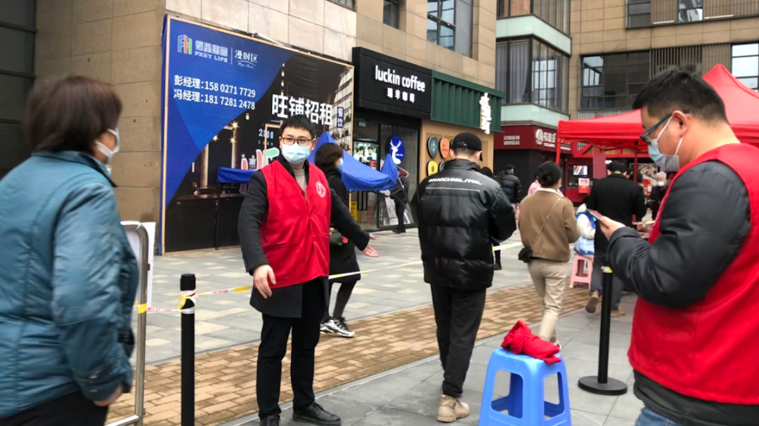 “请您提前准备武汉战疫健康码,检测很快的,请大家耐心等待。”“请大家保持一米远的安全距离,避免扎堆和聚集。”“请大家戴好口罩,做好防护。”检测现场,永业行志愿者不时提醒。